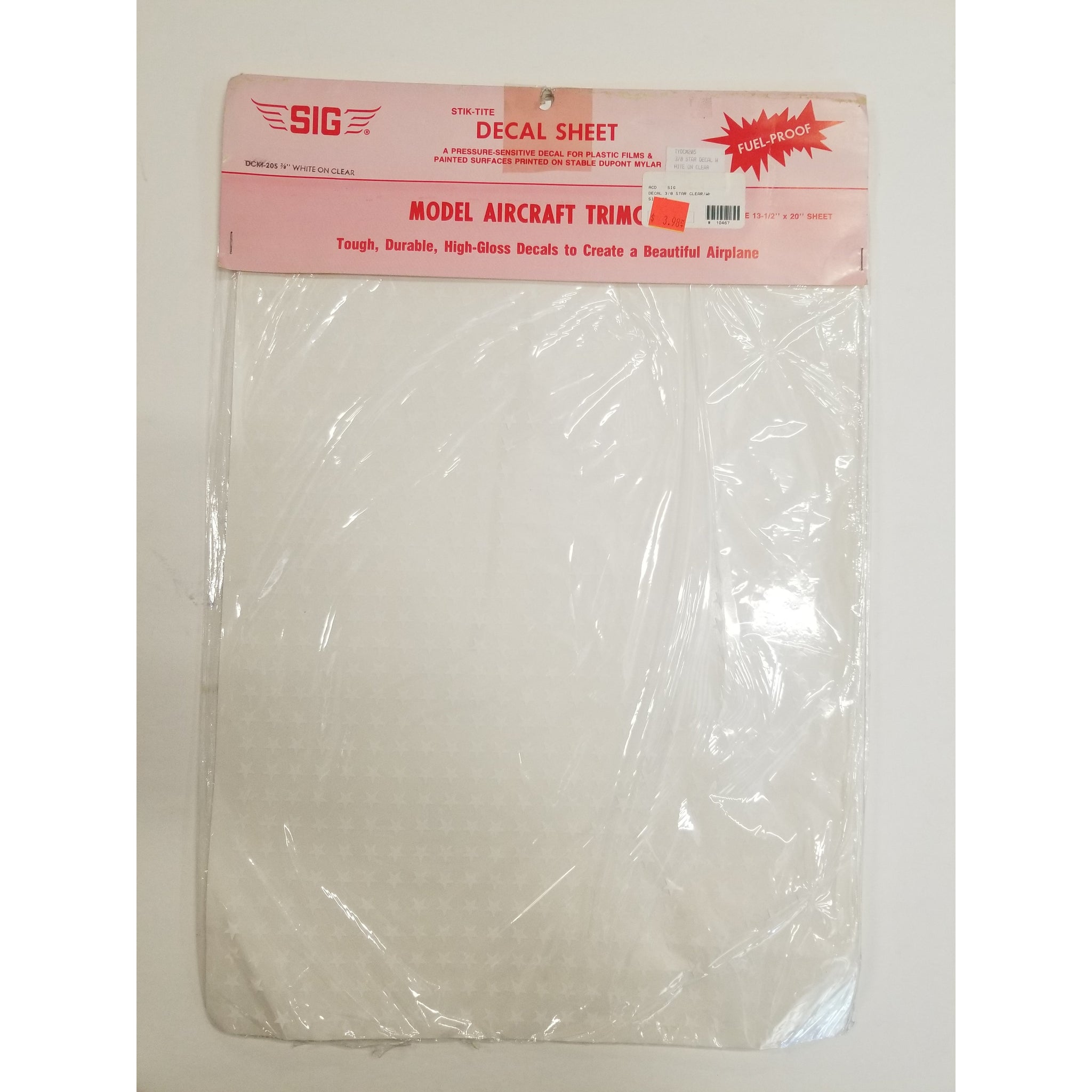 SIG Hobby part #DCM205. Model Aircraft Trimcals. Includes one 13 1/2" X 20" sheet. 3/8" stars, white on clear. Tough, durable, high-gloss, fuel-proof decals to create a beautiful airplane.